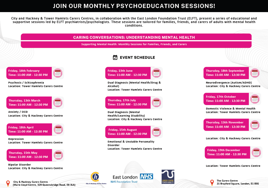 City and Hackney & Tower Hamlets Carers Centres have partnered with the East London Foundation Trust (ELFT) to bring you an invaluable opportunity.