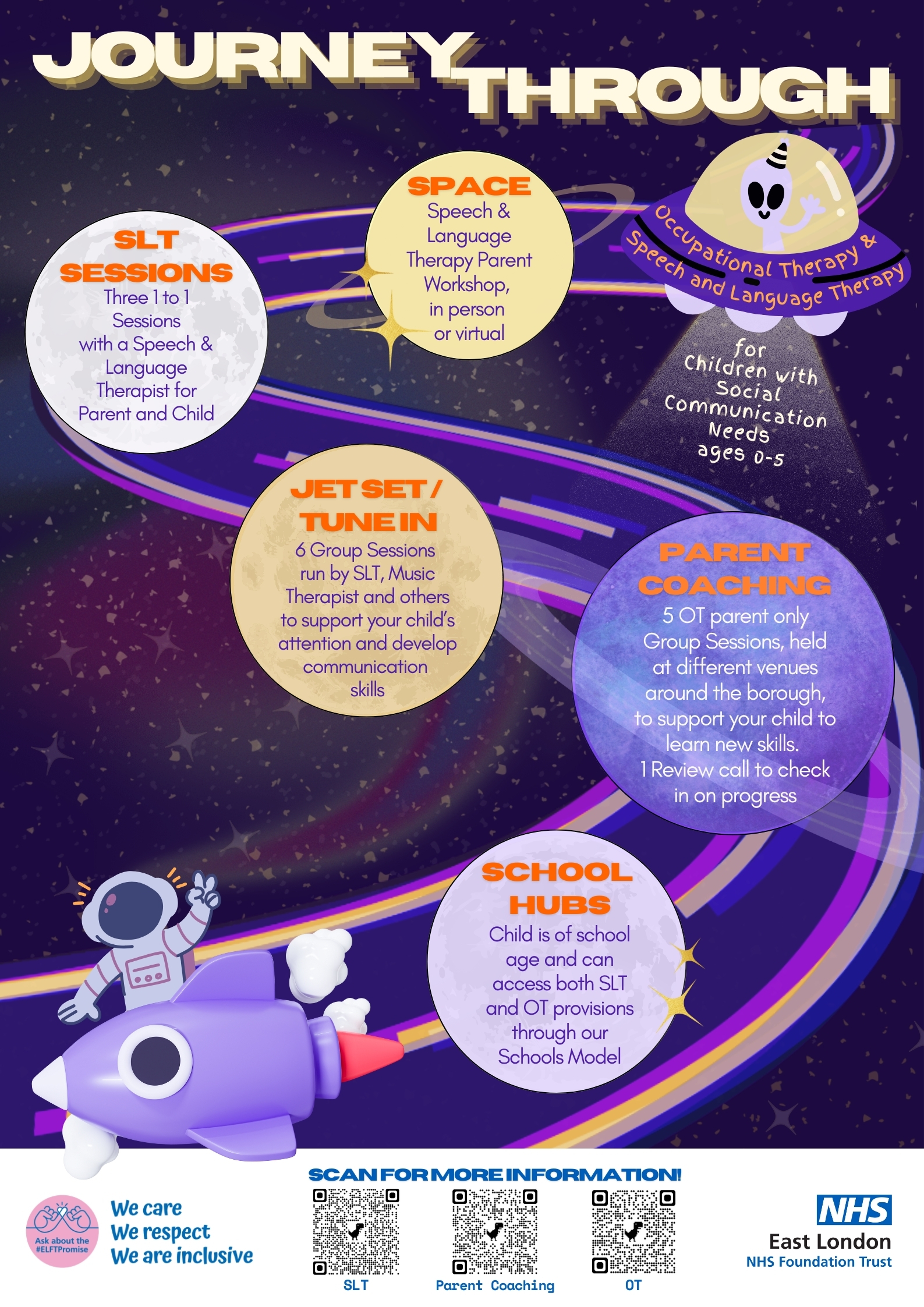 This offer is for parents of children who are pre-school age and have recently attended JetSet Group Sessions / Tune In Sessions delivered by the Speech & Language Therapy Service. This is the next step where we will provide you with tools and strategies to support your child as they continue on their journey within Specialist Children & Young People Services (SCYPS). These sessions offer families the opportunity to meet with other parents and share their lived experience.